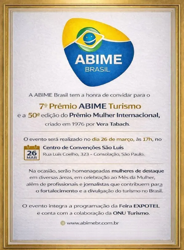 No próximo dia 26 de março, a capital paulista será o palco de uma das celebrações mais tradicionais do país em reconhecimento ao protagonismo feminino e ao setor de turismo. A ABIME Brasil (Associação Brasileira de Imprensa de Mídia Eletrônica e Digital) realiza o 7º Prêmio ABIME Turismo em conjunto com a histórica 50ª edição do Prêmio Mulher Internacional.